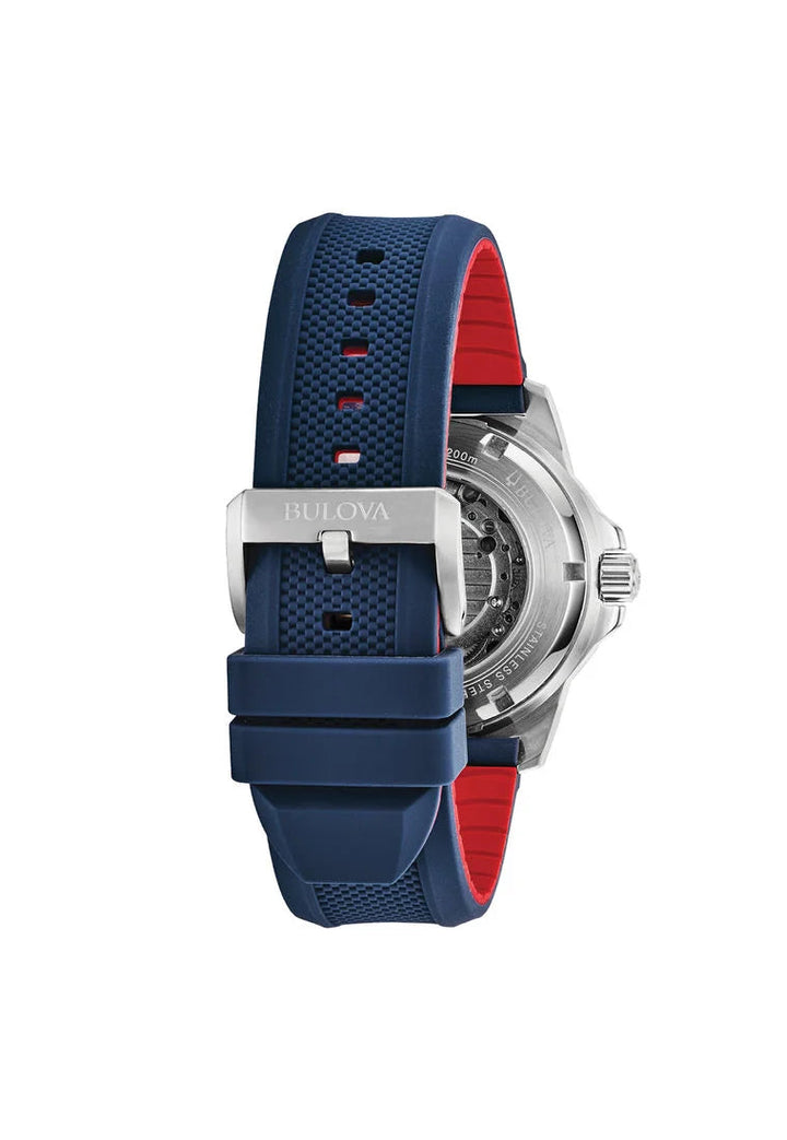 Presentamos el nuevo Marine Star con un movimiento automático de tres manecillas exhibido en una abertura abierta. Caja de acero inoxidable en tono oro rosa con anillo exterior en tono azul. Esfera azul con cristal mineral plano. Correa de silicona texturizada azul con parte inferior roja en contraste. Resistencia al agua hasta 200 metros.